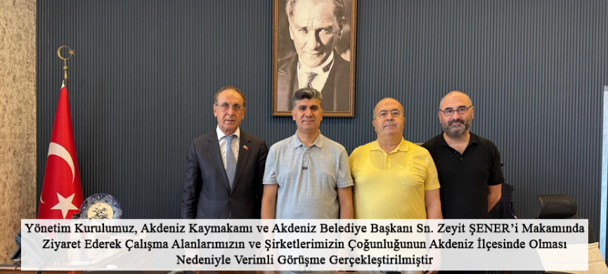 Yönetim Kurulumuz, Akdeniz Kaymakamı ve Akdeniz Belediye Başkanı Sn. Zeyit ŞENER?i Makamında Ziyaret Ederek Çalışma Alanlarımızın ve Şirketlerimizin Çoğunluğunun Akdeniz İlçesinde Olması Nedeniyle Verimli Görüşme Gerçekleştirilmiştir