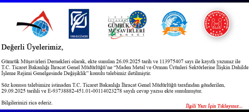 Dernekler Ortak Duyurusu / Maden Metal ve Orman Ürünleri Sektörlerine İlişkin Dahilde İşleme Rejimi Genelgesinde Değişiklik Hk.
