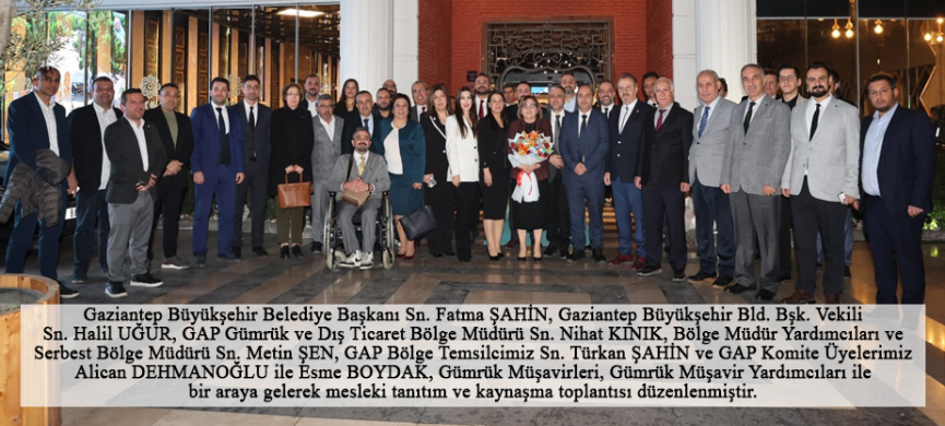 Gaziantep Büyükşehir Belediye Başkanı Sn. Fatma ŞAHİN, Gaziantep Büyükşehir Bld. Bşk. Vekili Sn. Halil UĞUR, GAP Gümrük ve Dış Ticaret Bölge Müdürü Sn. Nihat KINIK, Bölge Müdür Yardımcıları ve Serbest Bölge Müdürü Sn. Metin ŞEN, GAP Bölge Temsilcimiz Sn. Türkan ŞAHİN ve GAP Komite Üyelerimiz Alican DEHMANOĞLU ile Esme BOYDAK, Gümrük Müşavirleri, Gümrük Müşavir Yardımcıları ile bir araya gelerek mesleki tanıtım ve kaynaşma toplantısı düzenlenmiştir.