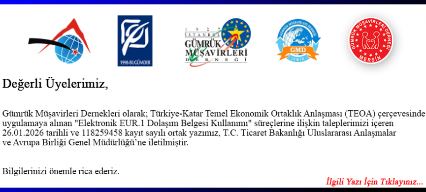Dernekler Ortak Duyurusu / Türkiye - Katar TEOA Kapsamında Elektronik EUR.1 Kullanımı Hk.