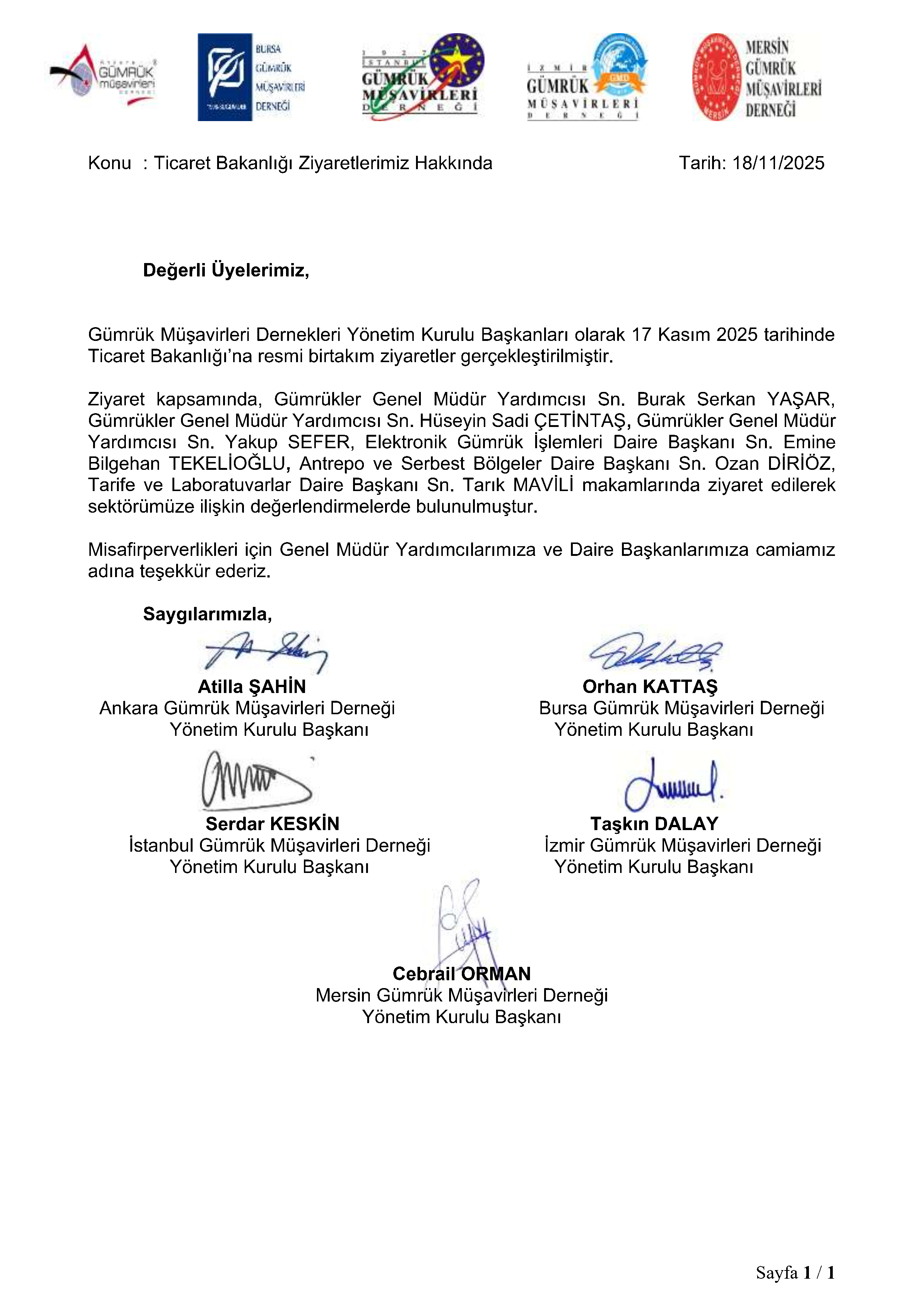 - Dernekler Ortak Duyurusu / Ticaret Bakan Yardımcısı Sn. Sezai UÇARMAK'a Ziyaret