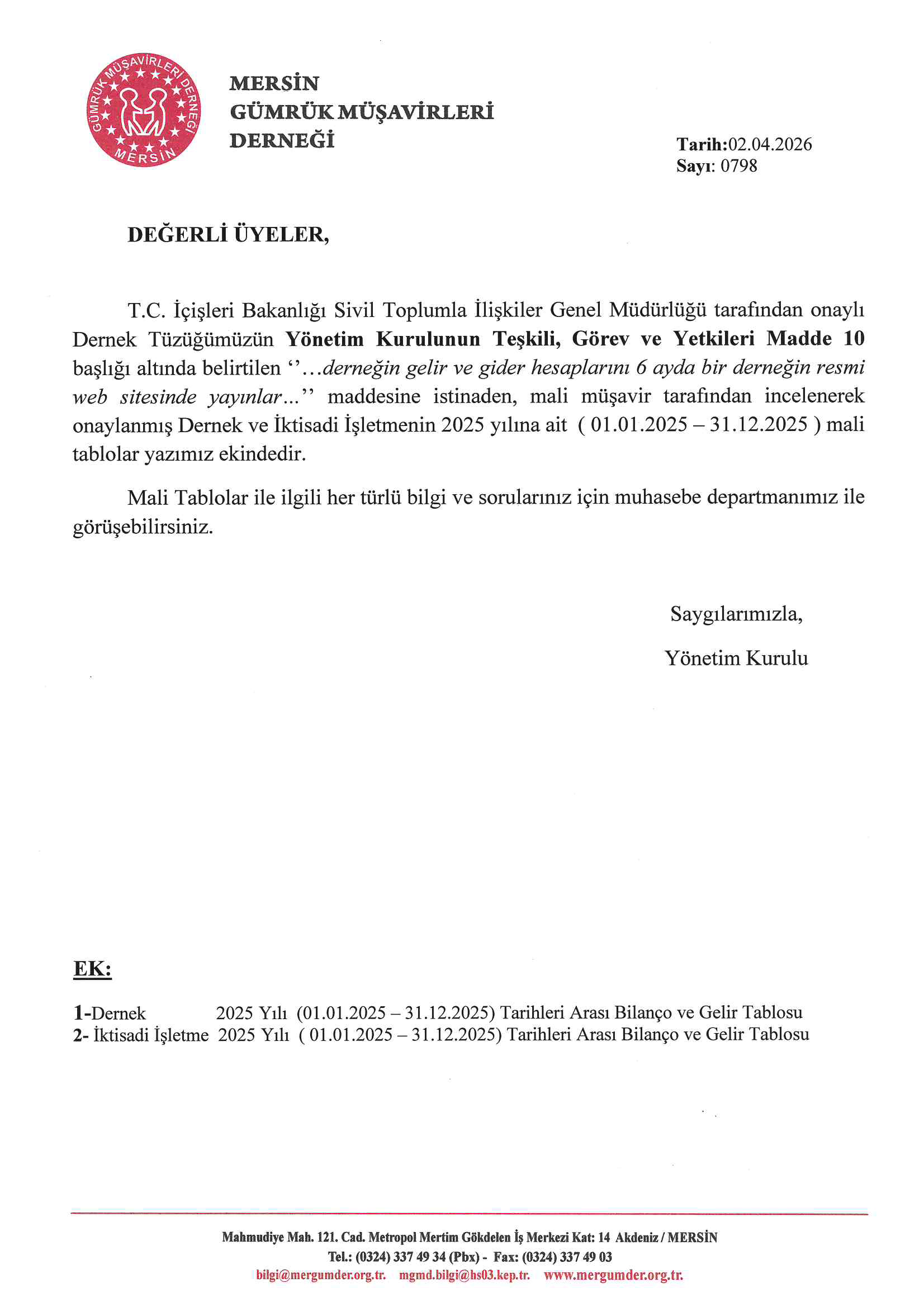 - Derneğimizin 2025 Yılı (01.01.2025 - 31.12.2025) Mali Tabloları İçin Tıklayınız... - İktisadi İşletmemizin 2025 Yılı (01.01.2025 - 31.12.2025) Mali Tabloları İçin Tıklayınız...