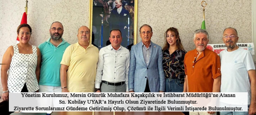 Yönetim Kurulumuz, Mersin Gümrük Muhafaza Kaçakçılık ve İstihbarat Müdürlüğü?ne Atanan Sn. Kubilay UYAR?a Hayırlı Olsun Ziyaretinde Bulunmuştur. Ziyarette Sorunlarımız Gündeme Getirilmiş Olup, Çözümü ile İlgili Verimli İstişarede Bulunulmuştur.