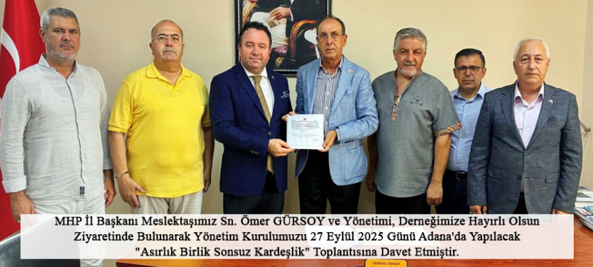 MHP İl Başkanı Meslektaşımız Sn. Ömer GÜRSOY ve Yönetimi, Derneğimize Hayırlı Olsun Ziyaretinde Bulunarak Yönetim Kurulumuzu 27 Eylül 2025 Günü Adana'da Yapılacak "Asırlık Birlik Sonsuz Kardeşlik" Toplantısına Davet Etmiştir.