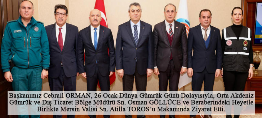 Başkanımız Cebrail ORMAN, 26 Ocak Dünya Gümrük Günü Dolayısıyla, Orta Akdeniz Gümrük ve Dış Ticaret Bölge Müdürü Sn. Osman GÖLLÜCE ve Beraberindeki Heyetle Birlikte Mersin Valisi Sn. Atilla TOROS?u Makamında Ziyaret Etti.