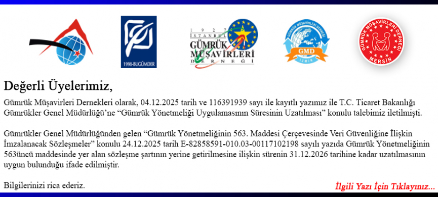 Dernekler Ortak Duyurusu / Gümrük Yönetmeliği Uygulamasının Süresinin Uzatılması Hk.