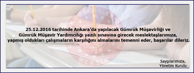 • Gümrük Müşavirliği ve Gümrük Müşavir Yardımcılığı Sınavlarına Girecek Adaylara Başarılar Dileriz