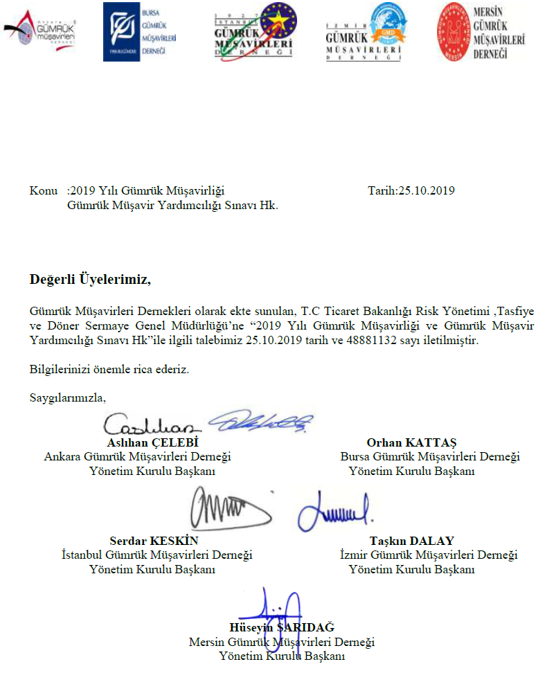 2019 Yılı Gümrük Müşavirliği ve Tarih: 25.10.2019 Gümrük Müşavir Yardımcılığı Sınavı Hk. Dernekler Ortak Yazısı İçin Tıklayınız...