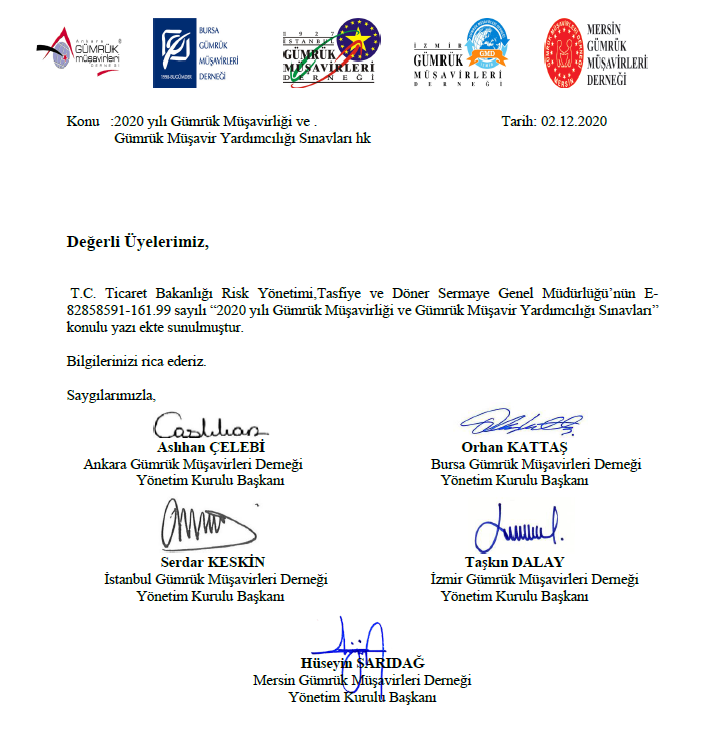Dernekler Ortak Duyurusu / 2020 Yılı Gümrük Müşavirliği ve Gümrük Müşavir Yardımcılığı Sınavları Hk.