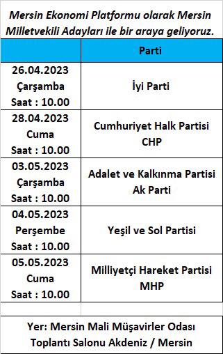 Mersin Ekonomi Platformu Paydaşları Olan Dernekler ve Mali Müşavirler Odası İşbirliği ile TBMM'de Grubu Olan Partilerin Milletvekili Adaylarıyla Yapılacak Olan Toplantılar Hk.