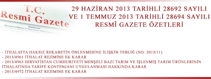29 Haziran 2013 Tarihli 28692 Sayılı - 1 Temmuz 2013 Tarihli 28694 Sayılı Resmî Gazete Özetleri